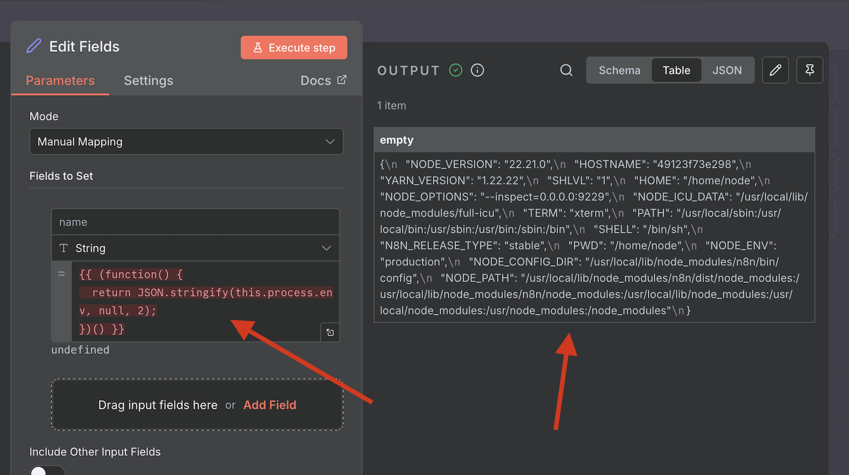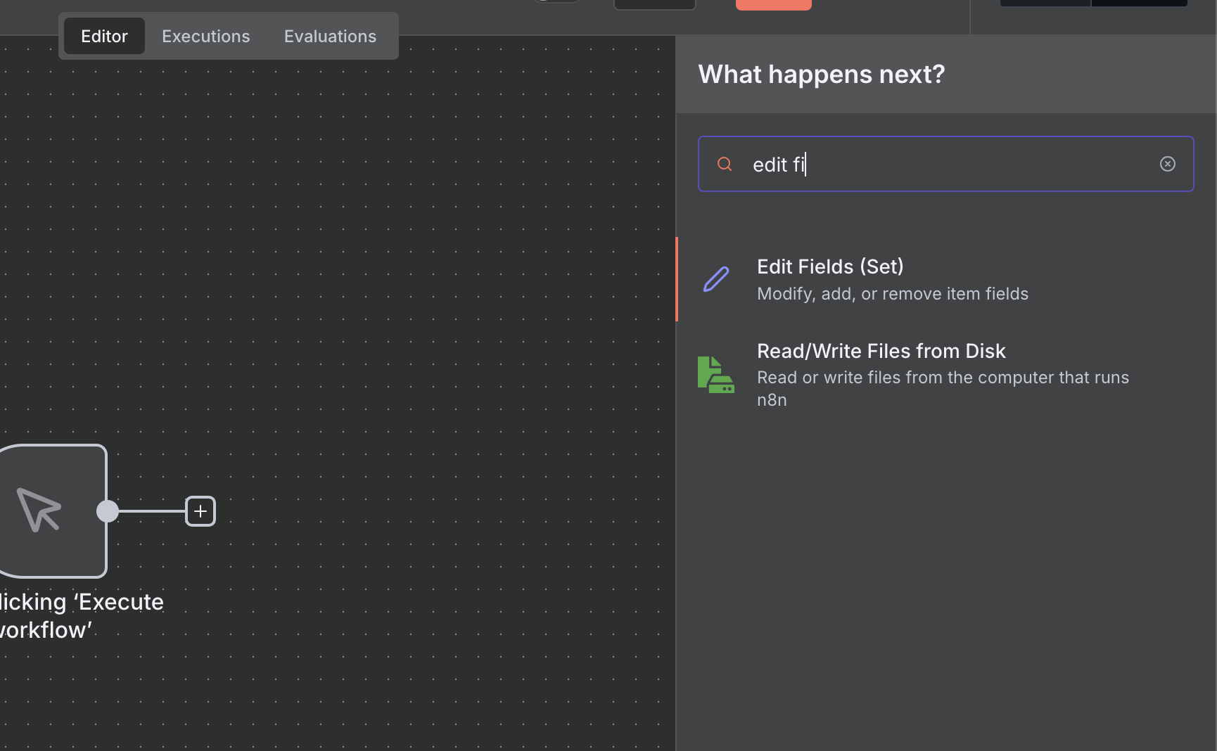 Add a Set node to the workflow. This node allows us to define values that can be evaluated as expressions.